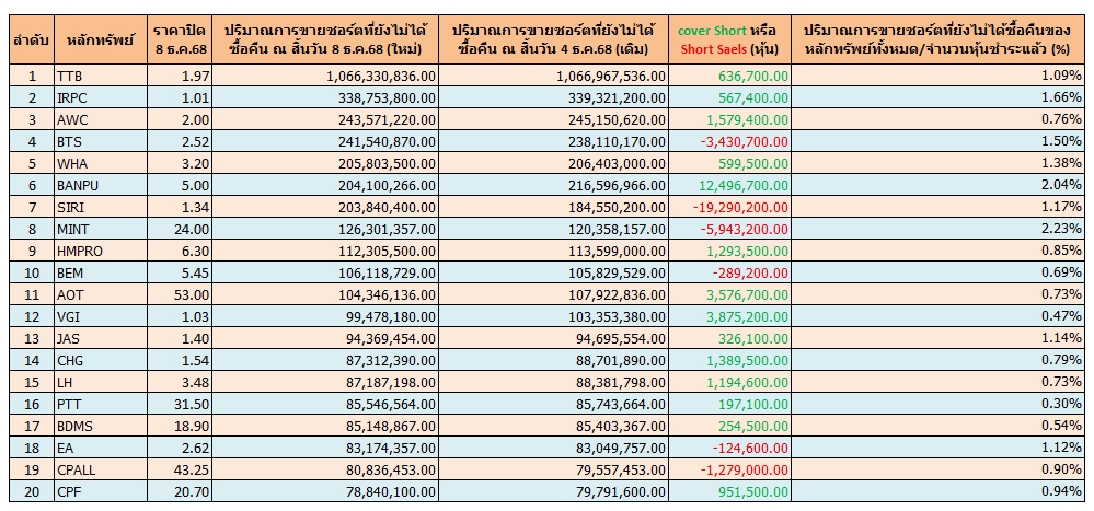 เปิด 20 อันดับหุ้นถูก “Cover-Short” สูงสุด ณ 8 ธ.ค.68
