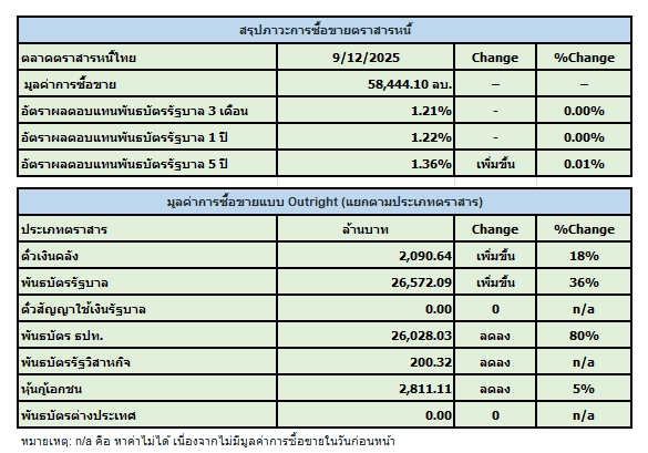 สมาคมตลาดตราสารหนี้ไทย (ThaiBMA) สรุปภาวะตลาดตราสารหนี้ไทยประจำวันนี้ มีมูลค่าการซื้อขายรวมทั้งวันอยู่ที่ 58,444 ล้านบาท ด้านประเภทของนักลงทุน ที่มีมูลค่าการซื้อขายสูงที่สุด 2 อันดับแรก คือ 1. กลุ่มบริษัทหลักทรัพย์จัดการกองทุน (บลจ.) ขายสุทธิ 212 ล้านบาท 2. กลุ่มบริษัทประกัน ซื้อสุทธิ 3,158 ล้านบาท ในขณะที่นักลงทุนต่างชาติ ซื้อสุทธิ 238 ล้านบาท