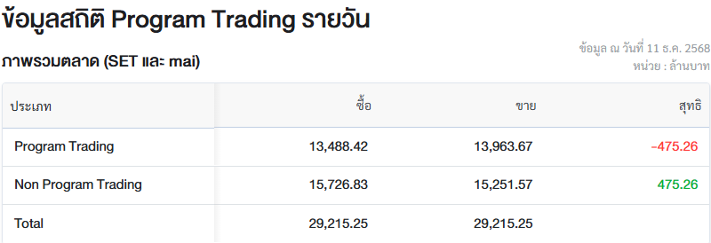 ผู้สื่อข่าวรายงานว่า วันนี้ (11 ธ.ค.68) ตลาดหลักทรัพย์แห่งประเทศไทย (ตลท.) เปิดเผยข้อมูลซื้อขายรายวันผ่าน Program Trading หรือ “โปรแกรมโรบอทเทรดดิ้ง” พบว่ามีมูลค่าซื้อจำนวน 13,488.42 ล้านบาท และมูลค่าขายจำนวน 13,963.67 ล้านบาท เท่ากับขายสุทธิ 475.26 ล้านบาท