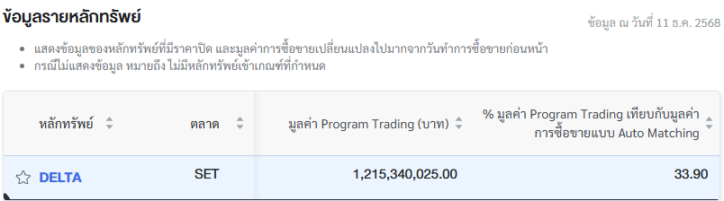 นอกจากนี้ ตลาดหลักทรัพย์แห่งประเทศไทย (ตลท.) รายงานข้อมูลหลักทรัพย์ที่มีการซื้อขายผ่านระบบ Program Trading สูงสุด โดยพิจารณาจากสัดส่วนมูลค่า Program Trading เทียบกับมูลค่าการซื้อขายแบบ Auto Matching พบว่ามี 1 หลักทรัพย์ที่มีการทำรายการสูงสุดในวันนี้ ได้แก่ DELTA