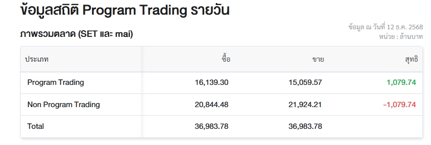 ผู้สื่อข่าวรายงานว่า วันนี้ (12 ธ.ค.68) ตลาดหลักทรัพย์แห่งประเทศไทย (ตลท.) เปิดเผยข้อมูลซื้อขายรายวันผ่าน Program Trading หรือ “โปรแกรมโรบอทเทรดดิ้ง” พบว่ามีมูลค่าซื้อจำนวน 16,139.30 ล้านบาท และมูลค่าขายจำนวน 15,059.57 ล้านบาท เท่ากับซื้อสุทธิ 1,079.74 ล้านบาท