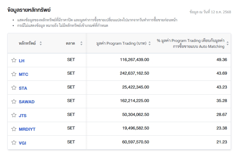 นอกจากนี้ ตลาดหลักทรัพย์แห่งประเทศไทย (ตลท.) รายงานข้อมูลหลักทรัพย์ที่มีการซื้อขายผ่านระบบ Program Trading สูงสุด โดยพิจารณาจากสัดส่วนมูลค่า Program Trading เทียบกับมูลค่าการซื้อขายแบบ Auto Matching พบว่า หลักทรัพย์ที่มีการทำรายการสูงสุดในวันนี้ ได้แก่