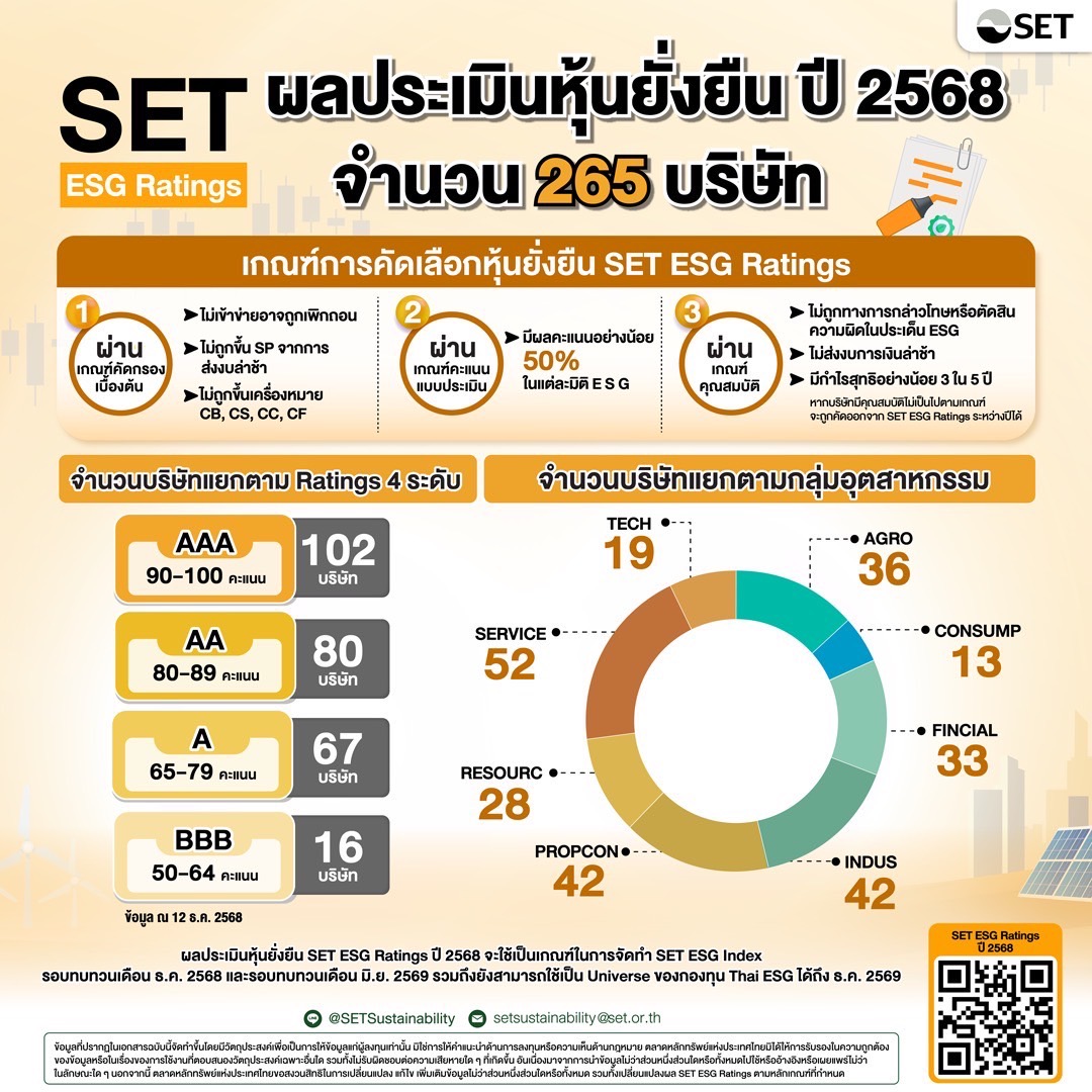 ตลาดหลักทรัพย์แห่งประเทศไทย(ตลท.) ประกาศผลการประเมินหุ้นยั่งยืน SET ESG Ratings ประจำปี 2568 โดยมีบริษัทจดทะเบียน (บจ.) ที่ผ่านเกณฑ์การประเมินรวม 265 บริษัท เพิ่มขึ้นจาก 219 บริษัทในปีที่ผ่านมา และในปีนี้ บจ. มีคะแนนเฉลี่ยสูงขึ้นในทุกมิติของ ESG แสดงให้เห็นถึงความพร้อมของ บจ. ในการก้าวสู่การประเมินตามมาตรฐานสากล FTSE Russell ESG Scores ในปี 2569
