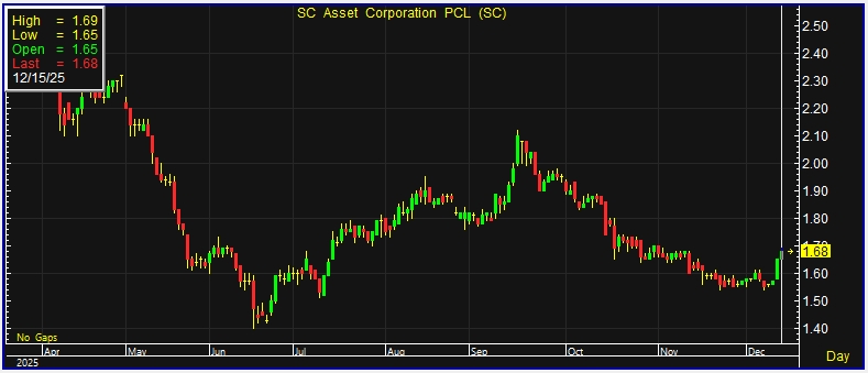 ผู้สื่อข่าวรายงานว่า วันนี้ (15 ธ.ค.68) ราคาหุ้น บริษัท เอสซี แอสเสท คอร์ปอเรชั่น จำกัด (มหาชน) หรือ SC ณ เวลา 10:19 น. อยู่ที่ระดับ 1.68 บาท บวก 0.03 บาท หรือ 1.82% ราคาสูงสุดที่ระดับ 1.69 บาท ราคาต่ำสุดที่ระดับ 1.65 บาท ด้วยมูลค่าซื้อขาย 6.87 ล้านบาท