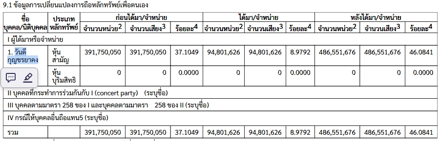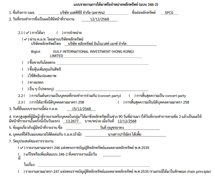 ผู้สื่อข่าวรายงานว่า วันนี้ (15 ธันวาคม 2568) สำนักงานคณะกรรมการกำกับหลักทรัพย์และตลาดหลักทรัพย์ (ก.ล.ต.) รายงานผ่านแบบรายงานการได้มาหรือจำหน่ายหลักทรัพย์ (แบบ 246-2) ว่า นางสาววันดี กุญชรยาคง ประธานกรรมการ บริษัท เอสพีซีจี จำกัด (มหาชน) หรือ SPCG ได้รายงานการได้มาซึ่งหุ้นของบริษัท เมื่อวันที่ 12 ธันวาคม 2568 ผ่านรายการซื้อขายแบบ Big Lot