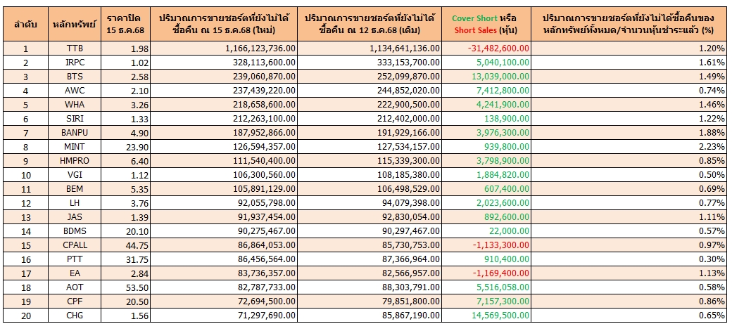 เปิด 20 อันดับหุ้นถูก “Cover-Short” สูงสุด ณ 15 ธ.ค.68