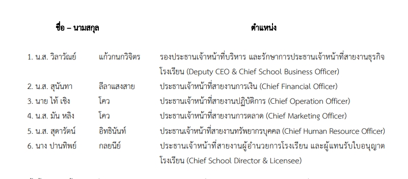 อีกทั้งรับทราบการแต่งตั้ง นางสาว วิลาวัณย์ แก้วกนกวิจิตร ให้ดำรงตำแหน่งรองประธานเจ้าหน้าหน้าที่บริหาร โดยมีผลตั้งแต่วันที่ 1 มกราคม 2569 เป็นตันไป และการแต่งตั้งและเปลี่ยนแปลงรายชื่อและทำแหน่งของของวิหารระดับสูง (ไม่รวมประธานเจ้าหน้าที่บริหาร)ในช่วงวันที่ 17-31 ธันวาคม 2568 ตามโครงสร้างองค์กรในข้อ 1) โดยมีผลตั้งแต่วันที่ 1 มกราคม 2569 เป็นต้นไป ประกอบด้วยผู้บริหาร จำนวน 6 ท่า น ดังนี้