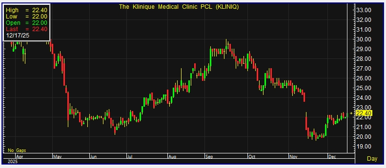 ผู้สื่อข่าวรายงานว่า วันนี้ (17 ธ.ค.68) ราคาหุ้นบริษัท เดอะคลีนิกค์ คลินิกเวชกรรม จำกัด (มหาชน) หรือ KLINIQ ณ เวลา 10:57น. อยู่ที่ระดับ 22.40 บาท บวก 0.40 บาท หรือ 1.82% ราคาสูงสุด 22.40 บาท ราคาต่ำสุด 22 บาท ด้วยมูลค่าซื้อขาย 1.01 ล้านบาท