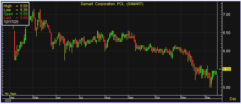 ผู้สื่อข่าวรายงานว่า วันนี้ (17 ธ.ค.68) ราคาหุ้น บริษัท สามารถคอร์ปอเรชั่น จำกัด (มหาชน) หรือ SAMART ณ เวลา 15:09 น. อยู่ที่ระดับ 5.50 บาท บวก 0.05 บาท หรือ 0.92% ราคาสูงสุดที่ระดับ 5.50 บาท ราคาต่ำสุดที่ระดับ 5.35 บาท ด้วยมูลค่าซื้อขาย 15.97 ล้านบาท