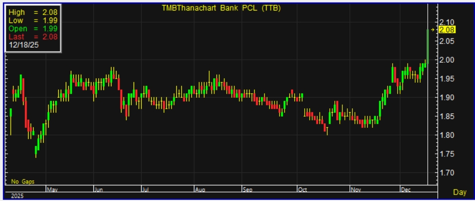 บริษัทหลักทรัพย์ ทิสโก้ จำกัด ระบุในบทวิเคราะห์ ว่าหลังจากที่ TTB ประกาศเมื่อปีที่แล้วว่าจะดำเนินโครงการซื้อหุ้นคืนทุกปีเป็นเวลาสามปี (2568-2570) เมื่อวานนี้ TTB ได้ยืนยันโครงการดังกล่าวสำหรับปี 2569 โดยใช้งบประมาณ 8.9 พันล้านบาท ราคาซื้อเบื้องต้นกำหนดไว้ที่ 1.90–2.00 บาท และธนาคารจะสรุปราคาซื้อที่แน่นอนในวันที่ 5 มกราคมปีหน้า ส่งผลให้จำนวนหุ้นที่จะซื้อคืนอยู่ที่ 4.5–4.7 พันล้านหุ้น หรือคิดเป็น 4.58%–4.80% ของจำนวนหุ้นที่ชำระแล้วทั้งหมด โดยกำหนดช่วงเวลาซื้อระหว่างวันที่ 22 มกราคม ถึง 4 กุมภาพันธ์ 2569