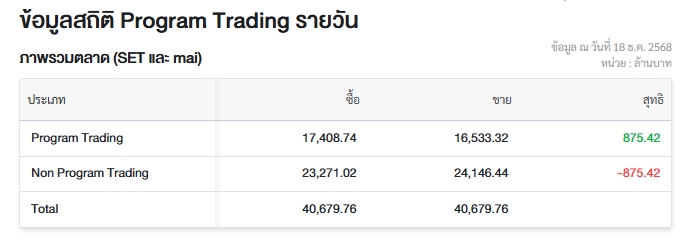 ผู้สื่อข่าวรายงานว่า วันนี้ (18 ธ.ค.68) ตลาดหลักทรัพย์แห่งประเทศไทย (ตลท.) เปิดเผยข้อมูลซื้อขายรายวันผ่าน Program Trading หรือ “โปรแกรมโรบอทเทรดดิ้ง” พบว่ามีมูลค่าซื้อจำนวน 17,408.74 ล้านบาท และมูลค่าขายจำนวน 16,533.32 ล้านบาท เท่ากับซื้อสุทธิ 875.42 ล้านบาท