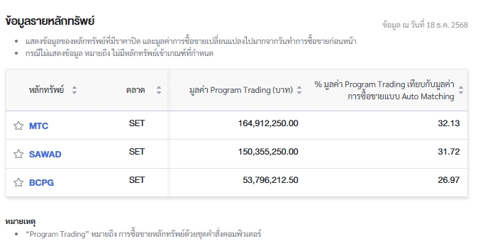 นอกจากนี้ ตลาดหลักทรัพย์แห่งประเทศไทย (ตลท.) รายงานข้อมูลหลักทรัพย์ที่มีการซื้อขายผ่านระบบ Program Trading สูงสุด โดยพิจารณาจากสัดส่วนมูลค่า Program Trading เทียบกับมูลค่าการซื้อขายแบบ Auto Matching พบว่ามี 3หลักทรัพย์ที่มีการทำรายการสูงสุดในวันนี้ ได้แก่
