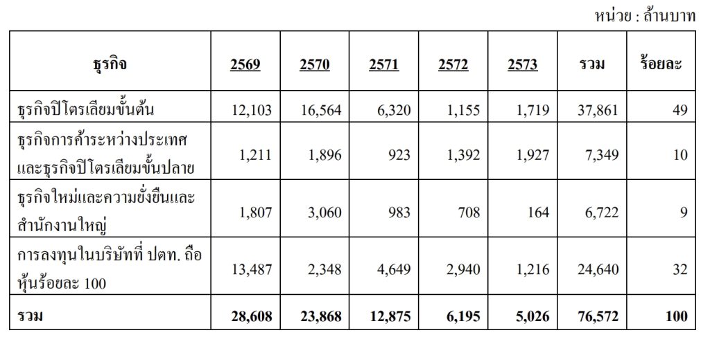 ทั้งนี้ เงินลงทุนในธุรกิจปิโตรเลียมขั้นต้น ธุรกิจการค้าระหว่างประเทศ และธุรกิจปิโตรเลียมขั้นปลาย คิดเป็นสัดส่วนประมาณร้อยละ 59 ของงบลงทุนในช่วง 5 ปี โดยครอบคลุมโครงการสำคัญ อาทิ การลงทุนและปรับปรุงประสิทธิภาพระบบท่อส่งก๊าซธรรมชาติ โรงแยกก๊าซธรรมชาติ รวมถึงการขยายธุรกรรมการค้าระหว่างประเทศแบบครบวงจร