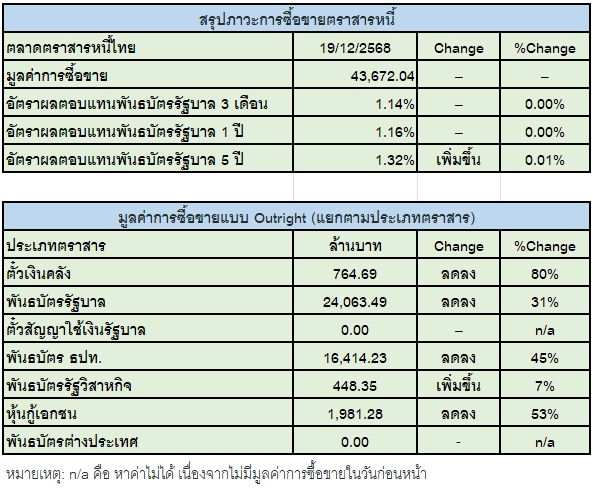 สมาคมตลาดตราสารหนี้ไทย (ThaiBMA) สรุปภาวะตลาดตราสารหนี้ไทยประจำวันนี้มีมูลค่าการซื้อขายรวมทั้งวันอยู่ที่ 43,672 ล้านบาท ด้านประเภทของนักลงทุน ที่มีมูลค่าการซื้อขายสูงที่สุด 2 อันดับแรก คือ 1. กลุ่มบริษัทหลักทรัพย์จัดการกองทุน (บลจ.) ซื้อสุทธิ 2,122 ล้านบาท 2. กลุ่มบริษัทประกัน ซื้อสุทธิ 512 ล้านบาท ในขณะที่นักลงทุนต่างชาติ ขายสุทธิ 1,220 ล้านบาท Yield พันธบัตรอายุ 5 ปี ปิดที่ 1.32% ปรับตัวเพิ่มขึ้นจากเมื่อวาน +0.01%