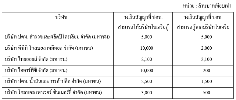ทั้งนี้ วงเงินสัญญาที่ ปตท. สามารถให้บริษัทในเครือกู้รวมทั้งสิ้น 32,600 ล้านบาท ขณะที่วงเงินสัญญาที่ ปตท. สามารถกู้จากบริษัทในเครือ รวมทั้งสิ้น 11,300 ล้านบาท
