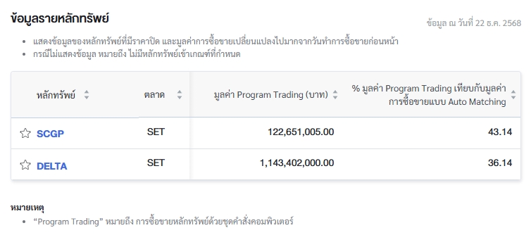 นอกจากนี้ ตลาดหลักทรัพย์แห่งประเทศไทย (ตลท.) รายงานข้อมูลหลักทรัพย์ที่มีการซื้อขายผ่านระบบ Program Trading สูงสุด โดยพิจารณาจากสัดส่วนมูลค่า Program Trading เทียบกับมูลค่าการซื้อขายแบบ Auto Matching พบว่ามี หลักทรัพย์ที่มีการทำรายการสูงสุดในวันนี้ ได้แก่ SCGP, DELTA