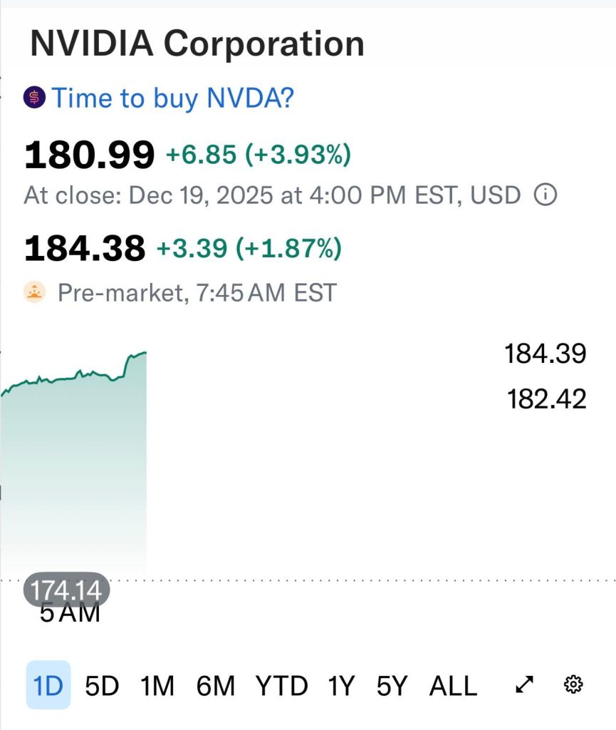 ผู้สื่อข่าวรายงานราคาหุ้นบริษัท Nvidia Corporation (NVDA) ปรับตัวเพิ่มขึ้นอย่างแข็งแกร่ง โดยปิดการซื้อขายวันที่ 19 ธันวาคม 2568 ที่ระดับ 180.99 ดอลลาร์ เพิ่มขึ้น 6.85 ดอลลาร์ หรือ 3.93% จากวันก่อนหน้า