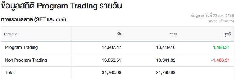 ผู้สื่อข่าวรายงานว่า วันนี้ (23ธ.ค.68) ตลาดหลักทรัพย์แห่งประเทศไทย (ตลท.) เปิดเผยข้อมูลซื้อขายรายวันผ่าน Program Trading หรือ “โปรแกรมโรบอทเทรดดิ้ง” พบว่ามีมูลค่าซื้อจำนวน 14,907.47 ล้านบาท และมูลค่าขายจำนวน 13,419.16 ล้านบาท เท่ากับซื้อสุทธิ 1,488.31 ล้านบาท