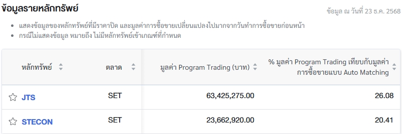 นอกจากนี้ ตลาดหลักทรัพย์แห่งประเทศไทย (ตลท.) รายงานข้อมูลหลักทรัพย์ที่มีการซื้อขายผ่านระบบ Program Trading สูงสุด โดยพิจารณาจากสัดส่วนมูลค่า Program Trading เทียบกับมูลค่าการซื้อขายแบบ Auto Matching พบว่ามี หลักทรัพย์ที่มีการทำรายการสูงสุดในวันนี้ ได้แก่ JTS และ STECON