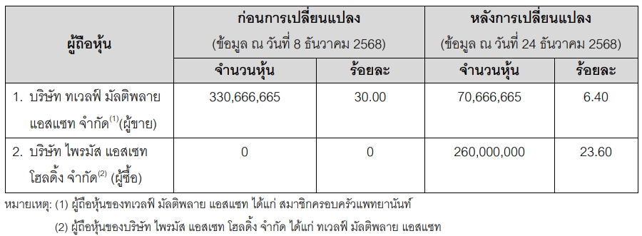 โดยบริษัท ทเวลฟ์ มัลติพลาย แอสแซท จำกัด ได้ดำเนินการขายหุ้นของบริษัทฯประมาณร้อยละ 23.60 ของจำนวนหุ้นที่ออกและจำหน่ายแล้วทั้งหมดและของทุนชำระแล้วของบริษัทฯ ให้แก่ บริษัท ไพรมัส แอสเซท โฮลดิ้ง จำกัด ซึ่งเป็นบริษัทที่บริษัท ทเวลฟ์ มัลติพลาย แอสแซท จำกัด ถือหุ้นในสัดส่วนที่ไม่น้อยกว่าร้อยละ 90 ทั้งนี้การซื้อขายหุ้นดังกล่าวส่งผลให้มีการเปลี่ยนแปลงโครงสร้างการถือหุ้นของผู้ ถือหุ้นรายใหญ่ของบริษัทฯ ดังต่อไปนี้