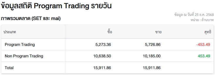ผู้สื่อข่าวรายงานว่า วันนี้ (25 ธ.ค.68) ตลาดหลักทรัพย์แห่งประเทศไทย (ตลท.) เปิดเผยข้อมูลซื้อขายรายวันผ่าน Program Trading หรือ “โปรแกรมโรบอทเทรดดิ้ง” พบว่ามีมูลค่าซื้อจำนวน 5,273.36 ล้านบาท และมูลค่าขายจำนวน 5,726.86 ล้านบาท เท่ากับขายสุทธิ 453.49 ล้านบาท
