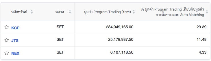 นอกจากนี้ ตลาดหลักทรัพย์แห่งประเทศไทย (ตลท.) รายงานข้อมูลหลักทรัพย์ที่มีการซื้อขายผ่านระบบ Program Trading สูงสุด โดยพิจารณาจากสัดส่วนมูลค่า Program Trading เทียบกับมูลค่าการซื้อขายแบบ Auto Matching พบว่ามี 3 หลักทรัพย์ที่มีการทำรายการสูงสุดในวันนี้ ได้แก่