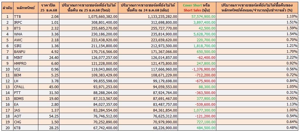 ผู้สื่อข่าวรายงานอ้างอิงการเปิดเผยข้อมูลของ ตลาดหลักทรัพย์แห่งประเทศไทย (ตลท.) เกี่ยวกับหลักทรัพย์ที่ยังคงสถานะการขายชอร์ตที่ยังไม่ได้ซื้อคืน (Outstanding Short Positions) ณ วันที่ 25 ธ.ค.68 โดยพบว่ามีหลักทรัพย์ที่ยังคงสถานะการขายชอร์ตที่ยังไม่ได้ซื้อคืน (รวม NDVR) จำนวนทั้งหมด 231 หลักทรัพย์ โดยหุ้นที่คงสถานะขายชอร์ตที่ยังไม่ได้ซื้อคืนสูงสุด 5 อันดับแรกประกอบด้วย