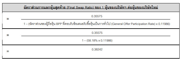 (ข) อัตราส่วนการแลกหุ้นสุดท้าย (Final Swap Ratio) ของ BPP เท่ากับ 1 หุ้นเดิมของ BPP ต่อ 0.80208 หุ้นของบริษัทใหม่ ซึ่งคำนวณตามสูตรดังต่อไปนี้