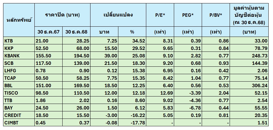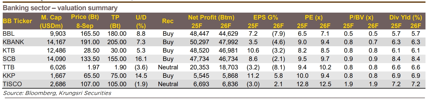อย่างไรก็ตาม แม้ราคาหุ้นธนาคารจะปรับตัวขึ้นแรงในปีนี้ แต่ในเชิงมูลค่า หุ้นส่วนใหญ่ยังซื้อขายต่ำกว่ามูลค่าทางบัญชี โดยมีค่า P/BV ต่ำกว่า 1 เท่า อาทิ KTB, KBANK, SCB, BBL, TTB, TCAP และ LHFG ขณะที่ค่า P/E ในปี 2568–2569 ของหลายธนาคารอยู่ในช่วงเพียง 6–10 เท่า ซึ่งต่ำกว่าค่าเฉลี่ยระยะยาว