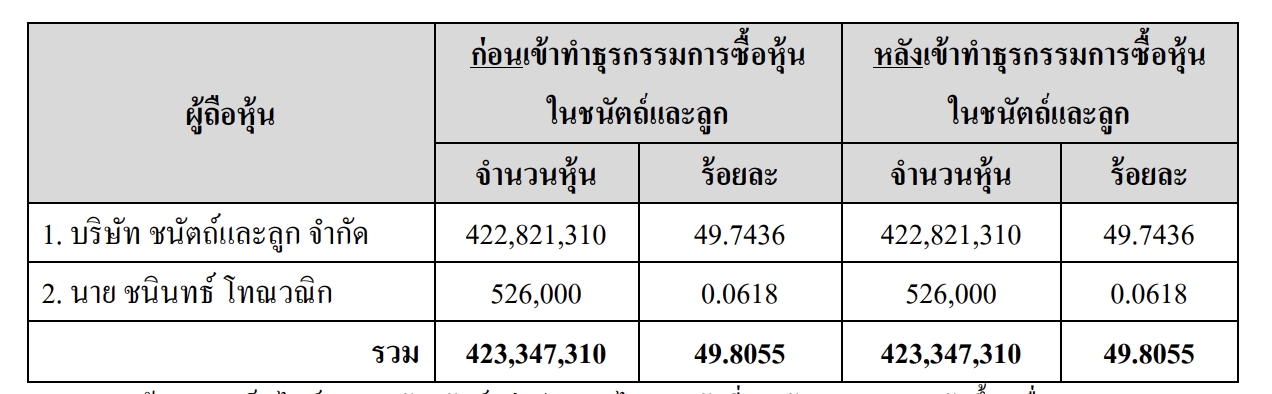 ทั้งนี้ เมื่อวันที่ 26 ธันวาคม 2568 นายชนินทธ์ได้เข้าซื้อหุ้นของบริษัท ชนัตถ์และลูก จำกัด จำนวน 1,200,000 หุ้น หรือคิดเป็นร้อยละ 15.96 ของหุ้นที่ออกและจำหน่ายแล้วทั้งหมด จากนางสุนงค์ สาลีรัฐวิภาค ส่งผลให้นายชนินทธ์มีสัดส่วนการถือหุ้นในบริษัท ชนัตถ์และลูก จำกัด เพิ่มขึ้นเป็นร้อยละ 41.36 ของหุ้นที่ออกและจำหน่ายแล้วทั้งหมด
