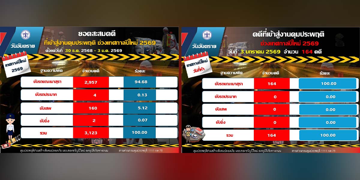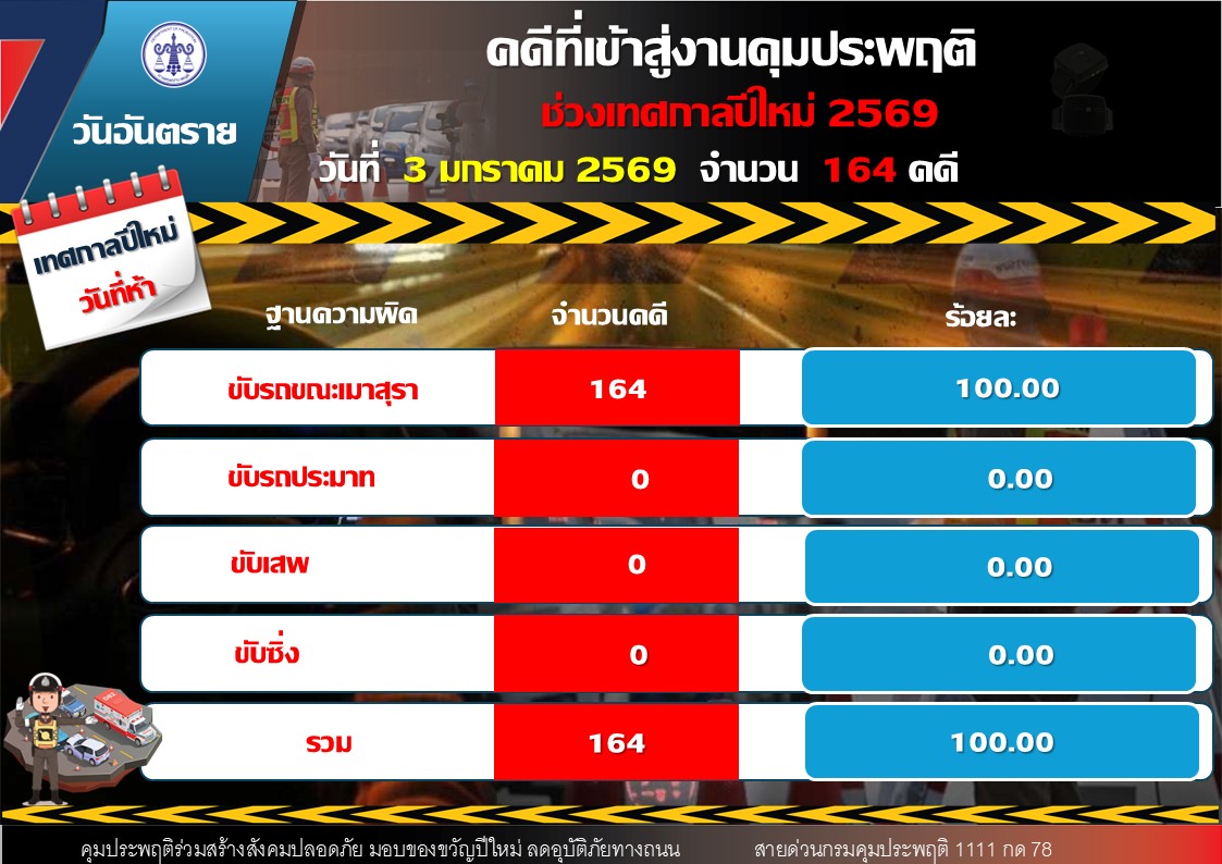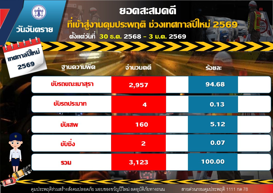 ขณะที่ยอดคดีสะสมตลอด 5 วัน (30 ธันวาคม 2568 – 3 มกราคม 2569) รวมทั้งสิ้น 3,123 คดี แบ่งเป็น 1.) ขับรถขณะเมาสุรา จำนวน 2,957 คดี คิดเป็นร้อยละ 94.68 2.) ขับรถประมาท จำนวน 4 คดี คิดเป็นร้อยละ 0.13 3.) ขับเสพ จำนวน 160 คดี คิดเป็นร้อยละ 5.12 4.) ขับซิ่ง จำนวน 2 คดี คิดเป็นร้อยละ 0.07