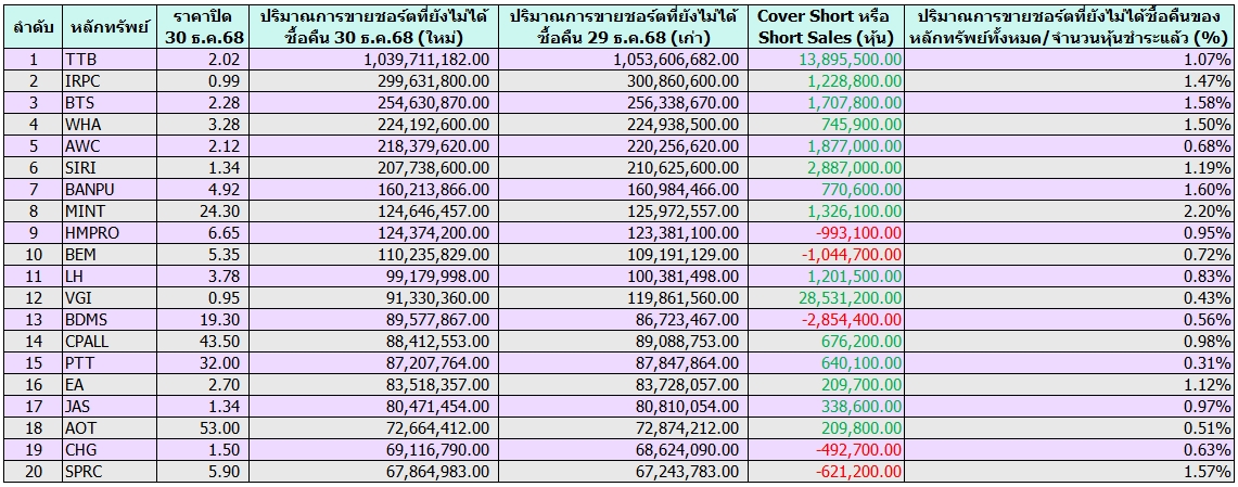 เปิด 20 อันดับหุ้นถูก “Cover-Short” สูงสุด ณ 30 ธ.ค.68