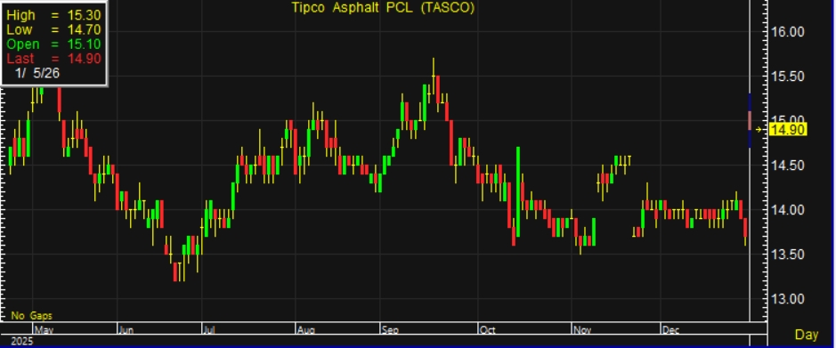 ผู้สื่อข่าวรายงานว่า วันนี้ (5 ม.ค. 69)ราคาหุ้น บริษัท ทิปโก้แอสฟัลท์ จำกัด (มหาชน) หรือ TASCO ณ เวลา 10:18 น. อยู่ที่ระดับ 14.90 บาท บวก 1.20 บาท หรือ 8.76% ราคาสูงสุดที่ระดับ 15.30 บาท ต่ำสุดที่ระดับ 14.70 บาท ด้วยมูลค่าการซื้อขาย 147.59 ล้านบาท