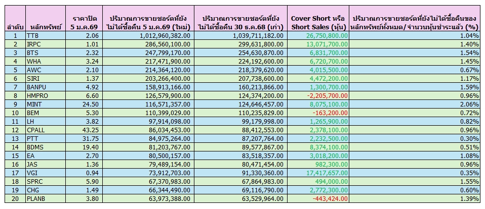 ผู้สื่อข่าวรายงานอ้างอิงการเปิดเผยข้อมูลของ ตลาดหลักทรัพย์แห่งประเทศไทย (ตลท.) เกี่ยวกับหลักทรัพย์ที่ยังคงสถานะการขายชอร์ตที่ยังไม่ได้ซื้อคืน (Outstanding Short Positions) ณ วันที่ 5 ม.ค.69 โดยพบว่ามีหลักทรัพย์ที่ยังคงสถานะการขายชอร์ตที่ยังไม่ได้ซื้อคืน (รวม NDVR) จำนวนทั้งหมด 231 หลักทรัพย์ โดยหุ้นที่คงสถานะขายชอร์ตที่ยังไม่ได้ซื้อคืนสูงสุด 5 อันดับแรกประกอบด้วย