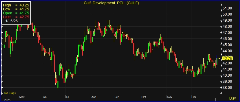 ผู้สื่อข่าวรายงานว่าวันนี้ (6 ม.ค.69) ราคาหุ้นบริษัท กัลฟ์ ดีเวลลอปเมนท์ จำกัด (มหาชน) หรือ GULF ณ เวลา 10:57น. อยู่ที่ระดับ 42.75 บาท บวก 1.25 บาท หรือ 3.01% ราคาสูงสุด 43.25 บาท ราคาต่ำสุด 41.75 บาท ด้วยมูลค่าซื้อขาย 575.18 ล้านบาท