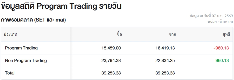 ผู้สื่อข่าวรายงานว่า วันนี้ (7 ม.ค.69) ตลาดหลักทรัพย์แห่งประเทศไทย (ตลท.) เปิดเผยข้อมูลซื้อขายรายวันผ่าน Program Trading หรือ “โปรแกรมโรบอทเทรดดิ้ง” พบว่ามีมูลค่าซื้อจำนวน 15,459 ล้านบาท และมูลค่าขายจำนวน 16,419.13 ล้านบาท เท่ากับขายสุทธิ 960.13 ล้านบาท