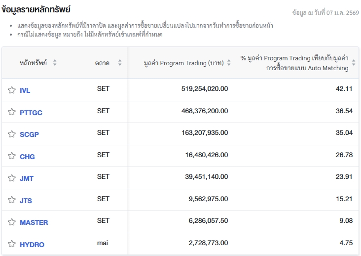 นอกจากนี้ ตลาดหลักทรัพย์แห่งประเทศไทย (ตลท.) รายงานข้อมูลหลักทรัพย์ที่มีการซื้อขายผ่านระบบ Program Trading สูงสุด โดยพิจารณาจากสัดส่วนมูลค่า Program Trading เทียบกับมูลค่าการซื้อขายแบบ Auto Matching พบว่ามี หลักทรัพย์ที่มีการทำรายการสูงสุดในวันนี้ ได้แก่