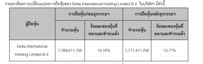 บริษัท เดลต้า อีเลคโทรนิคส์ (ประเทศไทย) จำกัด (มหาชน) หรือ DELTA แจ้งให้ตลาดหลักทรัพย์แห่งประเทศไทยทราบว่า บริษัท Delta International Holding Limited B.V. ซึ่งเป็นบริษัทย่อยของ Delta Electronics Inc.(DEI) ได้ขายหุ้นสามัญในบริษัทฯจำนวน 51,200,000 หุ้น คิดเป็นร้อยละ 0.41 ของหุ้นที่ออกและชำระแล้วทั้งหมดของบริษัทฯ ให้แก่นักลงทุนโดยการเสนอขายแบบเฉพาะเจาะจง เพื่อเพิ่มเงินทุนหมุนเวียนในการดำเนินธุรกิจปัจจุบันและขยายกิจการในอนาคต โดยได้ทำการซื้อขายบนกระดานซื้อขายรายใหญ่ (Big-Lot Board) ของตลาดหลักทรัพย์แห่งประเทศไทยเมื่อวันที่ 8 มกราคม 2569 (ธุรกรรมฯ) รายละเอียดการเปลี่ยนแปลงการถือหุ้นของ Delta International Holding Limited B.V. ในบริษัทฯ มีดังนี้