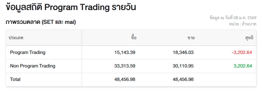 ขณะที่มูลค่าซื้อขายรายวันผ่าน Non Program Trading หรือ “การซื้อขายที่ไม่ใช่โปรแกรม” มีมูลค่าซื้อจำนวน 33,313.59 ล้านบาท และมูลค่าขายจำนวน 30,110.95 ล้านบาท เท่ากับซื้อสุทธิ 3,202.64 ล้านบาท