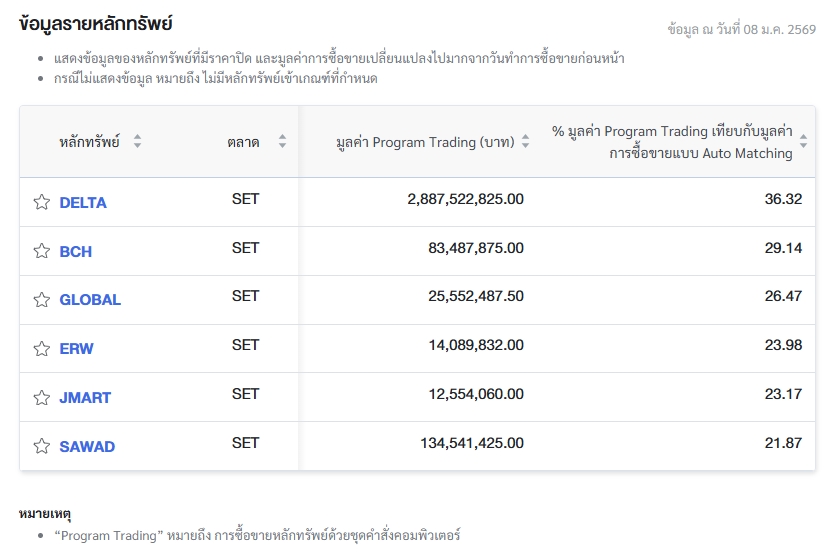 โดยบริษัทเดลต้า อีเลคโทรนิคส์ (ประเทศไทย) จำกัด (มหาชน) หรือ DELTA มีมูลค่าการซื้อขายผ่าน Program Trading จำนวน 2.88 พันล้านบาท คิดเป็น 36.32% ของมูลค่าการซื้อขายแบบ Auto Matching ซึ่งอยู่ที่ 1.67 หมื่นล้านบาท