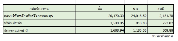 สมาคมตลาดตราสารหนี้ไทย (ThaiBMA) สรุปภาวะตลาดตราสารหนี้ไทยประจำวันนี้ มีมูลค่าการซื้อขายรวมทั้งวันอยู่ที่ 92,944 ล้านบาท ด้านประเภทของนักลงทุน ที่มีมูลค่าการซื้อขายสูงที่สุด 2 อันดับแรก คือ 1. กลุ่มบริษัทหลักทรัพย์จัดการกองทุน (บลจ.) ซื้อสุทธิ 2,152 ล้านบาท 2. กลุ่มบริษัทประกัน ซื้อสุทธิ 722 ล้านบาท ในขณะที่นักลงทุนต่างชาติ ซื้อสุทธิ 509 ล้านบาท