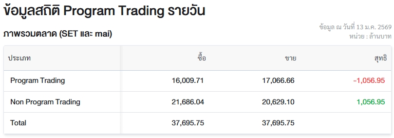 ผู้สื่อข่าวรายงานว่า วันนี้ (13 ม.ค.69) ตลาดหลักทรัพย์แห่งประเทศไทย (ตลท.) เปิดเผยข้อมูลซื้อขายรายวันผ่าน Program Trading หรือ “โปรแกรมโรบอทเทรดดิ้ง” พบว่ามีมูลค่าซื้อจำนวน 16,009.71 ล้านบาท และมูลค่าขายจำนวน 17,066.66 ล้านบาท เท่ากับขายสุทธิ 1,056.95 ล้านบาท