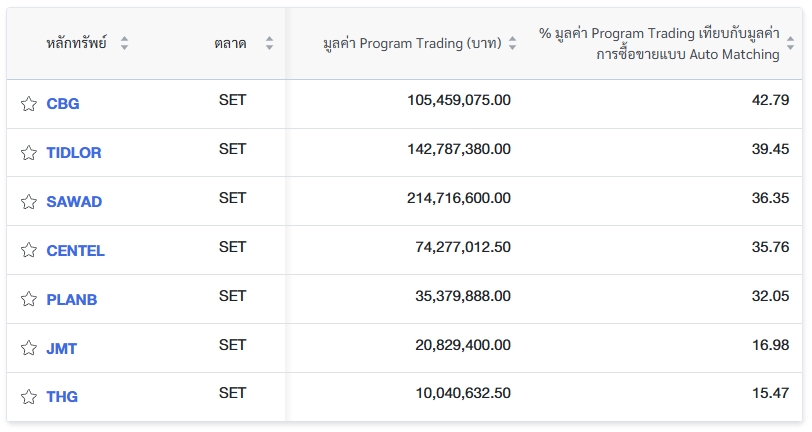 นอกจากนี้ ตลาดหลักทรัพย์แห่งประเทศไทย (ตลท.) รายงานข้อมูลหลักทรัพย์ที่มีการซื้อขายผ่านระบบ Program Trading สูงสุด โดยพิจารณาจากสัดส่วนมูลค่า Program Trading เทียบกับมูลค่าการซื้อขายแบบ Auto Matching พบว่ามี 7 หลักทรัพย์ที่มีการทำรายการสูงสุดในวันนี้ ได้แก่