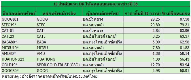 อย่างไรก็ตาม ข่าวหุ้นธุรกิจออนไลน์ได้รวบรวม DR ที่ให้ผลตอบแทนเป็นบวกสูงสุด 10 อันดับแรกในปี 2568 พบว่า DR ที่ให้ผลตอบแทนสูงสุด ได้แก่ Depositary Receipt on GOOGL Issued by BLS หรือ GOOGL01 ซึ่งให้ผลตอบแทนสูงถึง 87.50% โดยมีหุ้นอ้างอิงคือบริษัท Alphabet Inc. ซึ่งจดทะเบียนอยู่ในตลาดหลักทรัพย์ Nasdaq ประเทศสหรัฐอเมริกา และออกโดยบริษัทหลักทรัพย์ บัวหลวง ทั้งนี้ Alphabet เป็นบริษัทแม่ของ Google โดยมีรายได้หลักจากธุรกิจ Google Services และ Google Cloud