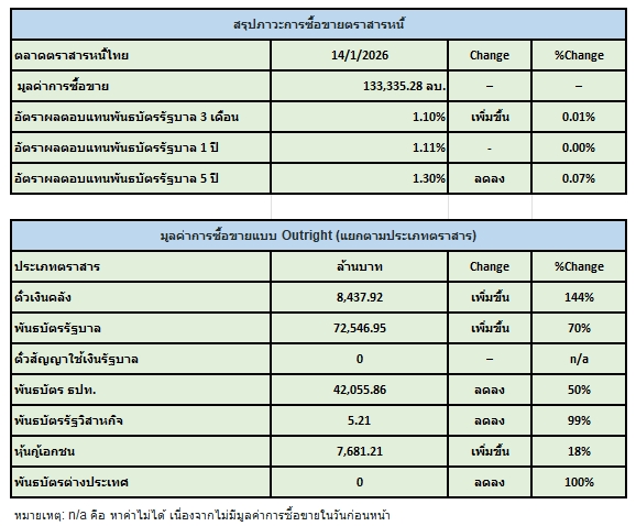 สมาคมตลาดตราสารหนี้ไทย(ThaiBMA) สรุปภาวะตลาดตราสารหนี้ไทยประจำวันนี้ มีมูลค่าการซื้อขายรวมทั้งวันอยู่ที่ 133,335 ล้านบาท ด้านประเภทของนักลงทุน ที่มีมูลค่าการซื้อขายสูงที่สุด 2 อันดับแรก คือ 1. กลุ่มบริษัทหลักทรัพย์จัดการกองทุน (บลจ.) ซื้อสุทธิ 16,360 ล้านบาท 2. กลุ่มบริษัทประกัน ซื้อสุทธิ 2,277 ล้านบาท ในขณะที่นักลงทุนต่างชาติ ซื้อสุทธิ 726 ล้านบาท Yield พันธบัตรอายุ 5 ปี ปิดที่ 1.3% ปรับตัวลดลงจากเมื่อวาน -0.07%