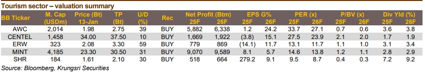 จากปัจจัยดังกล่าว บริษัทหลักทรัพย์ กรุงศรี จึงปรับคำแนะนำกลุ่มโรงแรมเป็น “Bullish” และเลือก AWC และ CENTEL เป็นหุ้นเด่น เนื่องจากมีสัดส่วนรายได้จากตลาดในประเทศสูง โดย AWC มีพอร์ตโรงแรมในประเทศ 100% และ CENTEL ประมาณ 73% ซึ่งจะได้รับประโยชน์โดยตรงจากการฟื้นตัวของนักท่องเที่ยวต่างชาติ โดยเฉพาะนักท่องเที่ยวจีนที่คาดว่าจะเริ่มกลับมาเห็นการเติบโตตั้งแต่ช่วงเดือนกุมภาพันธ์ถึงมีนาคมนี้ อย่างไรก็ตามยังต้องติดตามความเสี่ยงด้านภูมิรัฐศาสตร์และเหตุการณ์ที่อาจกระทบต่อบรรยากาศการเดินทางท่องเที่ยวในระยะถัดไป