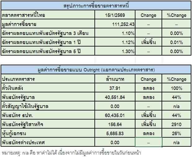 "กองทุน-ประกัน-ต่างชาติ" ประสานเสียงซื้อ "ตราสารหนี้ไทย" 6.6 พันล้านบาท ส่วน Yield พันธบัตรอายุ 5 ปี ปิดที่ 1.3% ไม่มีการเปลี่ยนแปลงจากเมื่อวาน