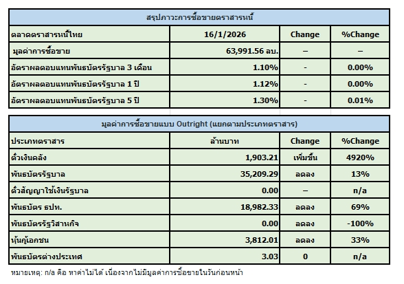 สมาคมตลาดตราสารหนี้ไทย (ThaiBMA) สรุปภาวะตลาดตราสารหนี้ไทยประจำวันนี้ มีมูลค่าการซื้อขายรวมทั้งวันอยู่ที่ 63,992 ล้านบาท ด้านประเภทของนักลงทุน ที่มีมูลค่าการซื้อขายสูงที่สุด 2 อันดับแรก คือ 1. กลุ่มบริษัทหลักทรัพย์จัดการกองทุน (บลจ.) ขายสุทธิ 1,127 ล้านบาท 2. กลุ่มบริษัทประกัน ซื้อสุทธิ 5 ล้านบาท ในขณะที่นักลงทุนต่างชาติ ซื้อสุทธิ 1,128 ล้านบาท
