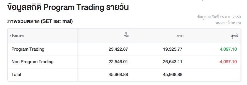 ขณะที่มูลค่าซื้อขายรายวันผ่าน Non Program Trading หรือ “การซื้อขายที่ไม่ใช่โปรแกรม” มีมูลค่าซื้อจำนวน 22,546.01 ล้านบาท และมูลค่าขายจำนวน 26,643.11 ล้านบาท เท่ากับขายสุทธิ 4,097.10 ล้านบาท