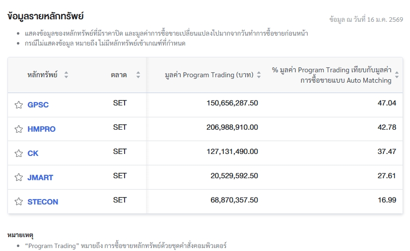 โดยบริษัท โกลบอล เพาเวอร์ ซินเนอร์ยี่ จำกัด (มหาชน) หรือ GPSC มีมูลค่าการซื้อขายผ่าน Program Trading จำนวน 150.65 ล้านบาท คิดเป็น 47.04% ของมูลค่าการซื้อขายแบบ Auto Matching ซึ่งอยู่ที่ 320.47 ล้านบาท